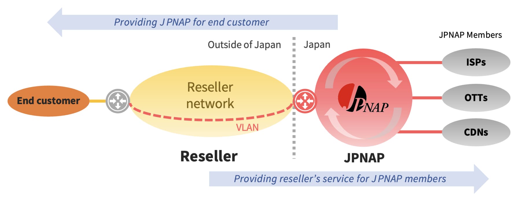JPNAP转售合作允许转售商将JPNAP与自身服务(如互联网转接(IP-Transit)或全球租赁专线等)绑定提供。